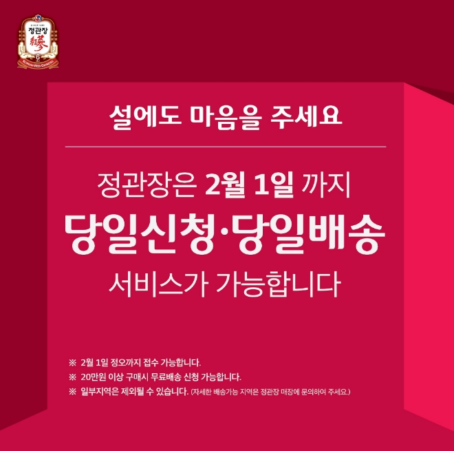 ‘당일신청·당일배송’ 서비스를 희망하는 고객들은 다음달 1일 정오까지 전국 정관장 매장에서 배송 가능 지역 여부를 확인 후 신청하면 된다. ‘당일신청·당일배송’ 서비스는 전국의 정관장 매장에서 신청이 가능하며, 20만원 이상 구매 고객에게는 무료로 서비스를 제공한다.