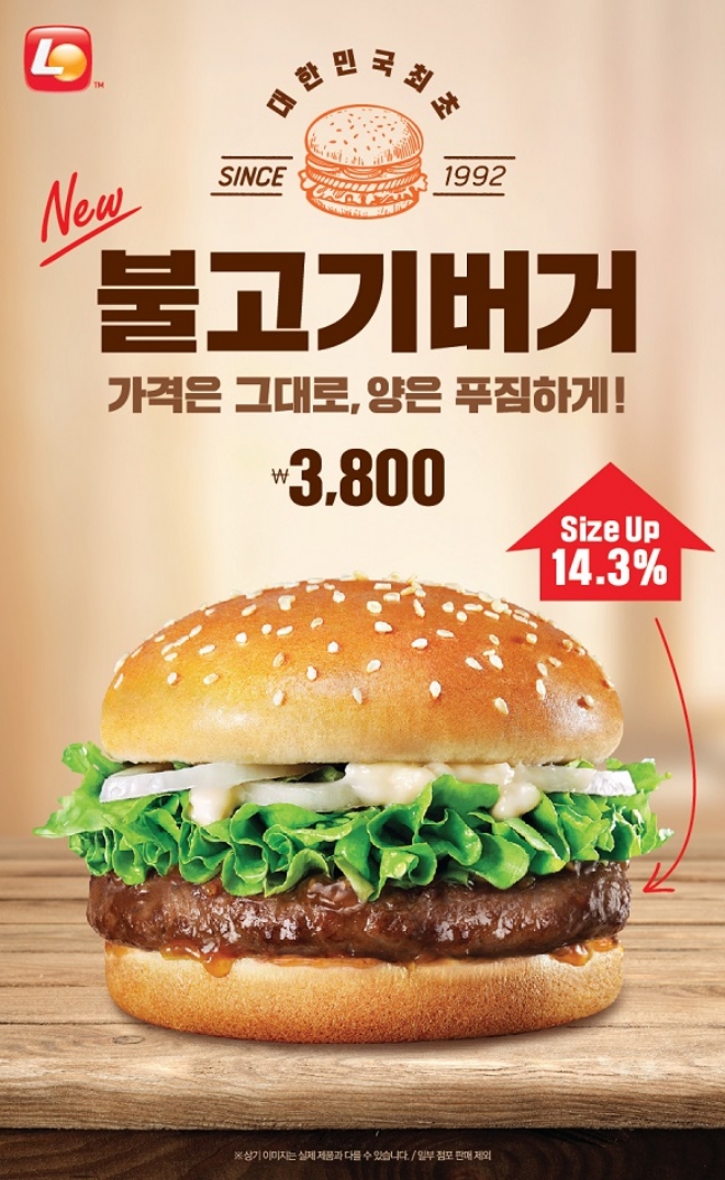 이미지 확대보기롯데리아는 올해 27주년을 맞은 불고기버거를 풍성하게 리뉴얼한다고 31일 밝혔다. 불고기버거 패티를 14%(기존 70g, 개선 80g) 증량해 더욱 풍성해진 NEW 불고기버거를 만날 수 있다. 가격은 단품 기준 3800원, 세트가격 5800원으로 변함없다.