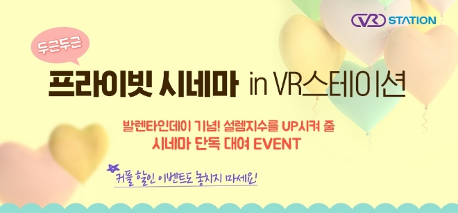 이미지 확대보기현대IT&E는 오는 13일까지 VR스테이션 강남점 내에 있는 VR시네마를 1시간 대여해주는 ‘프라이빗 시네마 인 VR스테이션’ 이벤트 참여 고객을 모집한다고 8일 밝혔다. 이 이벤트는 선착순으로 10커플 신청을 받아 오는 14일 낮 12시부터 밤 10시까지 한 시간 단위로 VR시네마를 단독으로 이용할 수 있다. VR스테이션 홈페이지 내 이벤트 페이지에서 희망 대여 시간을 선택하고 밸런타인데이 패키지를 구매하면 된다.