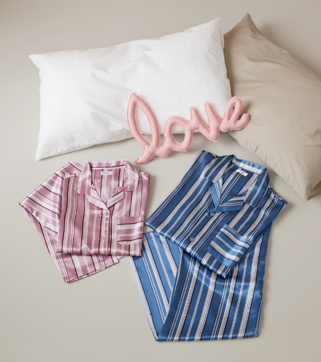 속옷 선물이 아직 부담스러운 초보 커플에게는 커플 아이템으로 활용하기 좋은 셔츠형 파자마를 추천했다. 비비안은 세련된 스트라이프가 무늬와 고급스러운 광택이 돋보이는 커플 파자마를 내놨다. 여성은 코랄 컬러, 남성은 블루 컬러로 배색 포인트를 줬다.