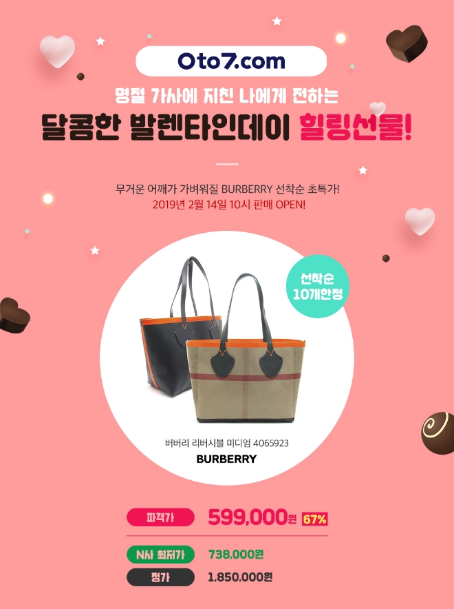선착순 10명을 대상으로 버버리 리버시블 토트백(미디움)을 59만원에 판매한다. 정상 판매가 대비 67% 할인된 가격이다. 또 버버리 체인 빈티지 체크 숄더백, 버버리 D링백, 페라가모(Ferragamo) 간치니 퀼팅 카메라백, 자넬라토(Zanellato) 블란디네 쇼퍼백, 레베카밍코프(Rebecca Minkoff) 미니맥 크로스백 등을 최대 83% 할인된 가격에 선보인다.