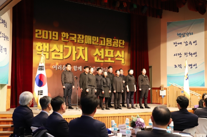 이미지 확대보기뉴딘파스텔의 ‘골프존파스텔합창단’은 13일 경기도 성남시에 위치한 한국장애인고용공단 본부에서 열린 ‘2019 한국장애인고용공단 핵심가치 선포식’에서 초청 공연을 펼쳤다고 밝혔다.