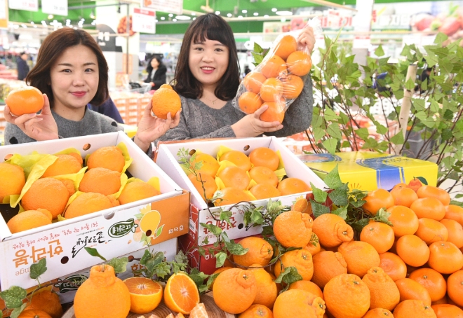 하나로마트 양재점에서는 24일까지 ‘제주 한라봉, 천혜향 마음대로 골라담기’ 행사를 통해 소비자가 가장 선호하는 대(大)사이즈의 한라봉(300g 이상)과 천혜향(250g 이상)을 아무거나 골라도 1개 1700원, 4개 5980원, 7개 9980원에 판매한다. 또 천혜향(2㎏) 1만5900원→1만2900원, 한라봉(3㎏) 2만3900원→1만7900원 등 최대 25% 할인 판매한다.