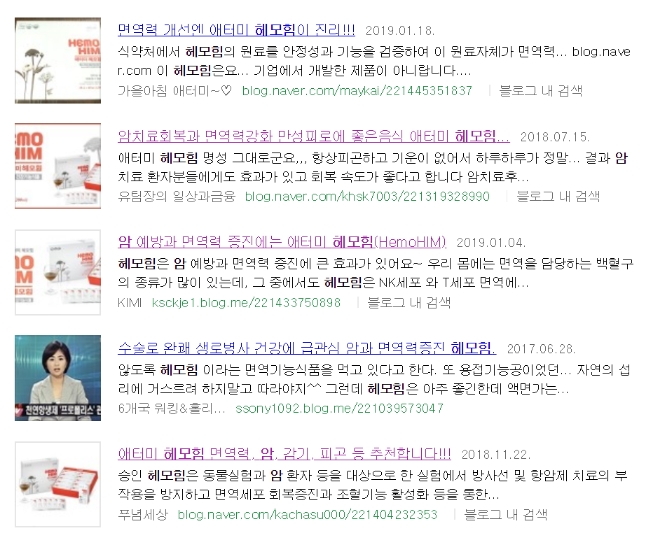 이런 블로그에는 “암환자들을 대상으로 임상 시험을 한 결과 효능을 입증했다”, “암 예방과 면역력 증진에 큰 효과가 있다” 등의 문구가 쓰여 있다. 판매원들의 설명과 달리 애터미는 인터넷 홈페이지에서 “면역력 개선에 도움을 줄 수 있는 개별인정형 건강기능식품”이라고 헤모힘을 소개하고 있다. 애터미의 여드름용 화장품을 의약품 혹은 의약외품인 여드름 치료용으로 오인할 수 있는 정보도 심심치 않게 볼 수 있다.