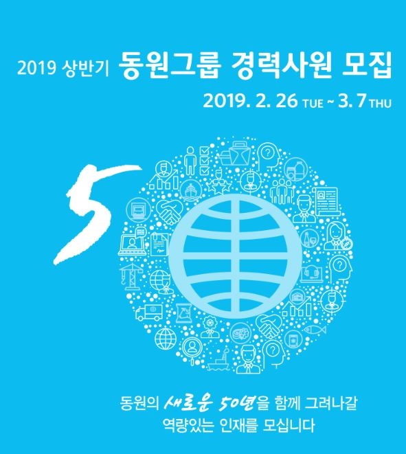 김인철 동원그룹 HR지원실장은 “이번 상반기 경력사원 모집은 올해 창립 50주년을 맞은 동원그룹의 각 계열사별 경쟁력을 강화하고, 새로운 50년을 함께할 역량 있는 인재들을 모시기 위해 진행된다”며 “우수한 인재들의 많은 지원을 바란다”고 전했다.