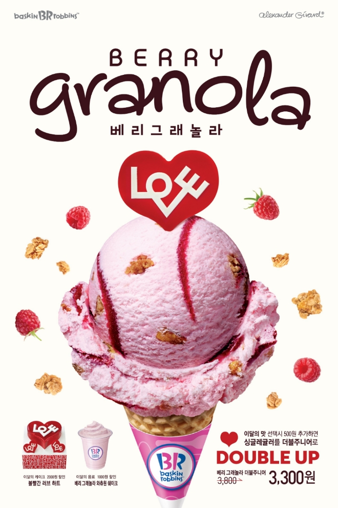 이미지 확대보기배스킨라빈스는 3월 이달의 맛 ‘베리 그래놀라’를 출시한다고 28일 밝혔다. 이달의 맛 ‘베리 그래놀라’는 마스카포네 치즈 아이스크림에 라즈베리 리본과 고소한 그래놀라가 들어간 제품이다. 우유를 넣어 블렌딩한 ‘베리 그래놀라 와츄원 쉐이크’도 선보인다.