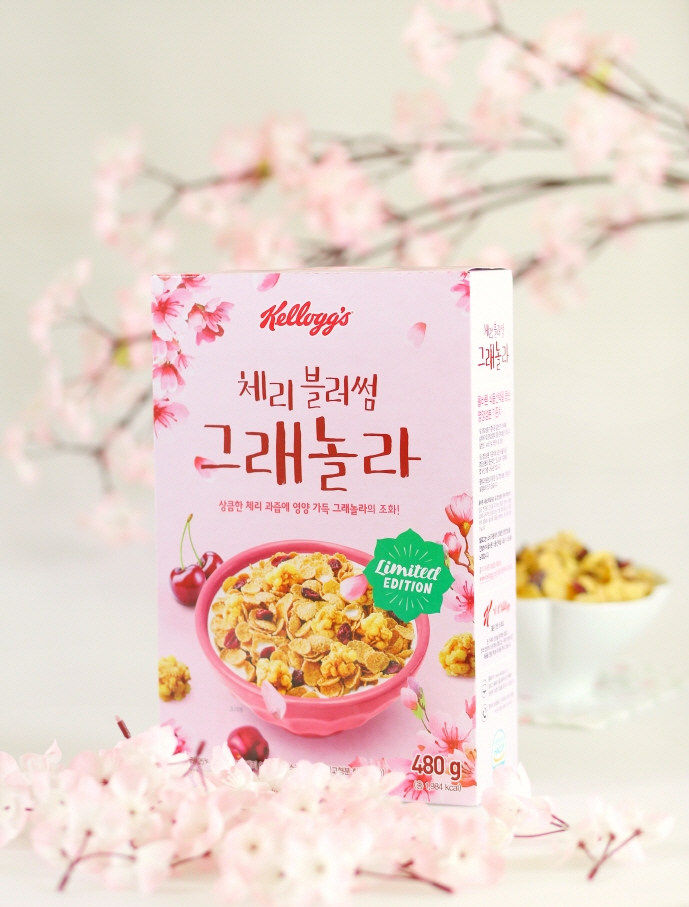 켈로그의 ‘체리블러썸 그래놀라’는 향긋한 체리향과 상큼한 체리 과즙을 그대로 느낄 수 있는 크랜베리와 귀리, 보리, 통밀, 쌀, 옥수수 5가지 곡물로 만든 통곡물 그래놀라에 바삭한 오곡 푸레이크 조합으로 상큼 고소한 맛뿐만 아니라 풍부한 영양까지 함께 제공한다.