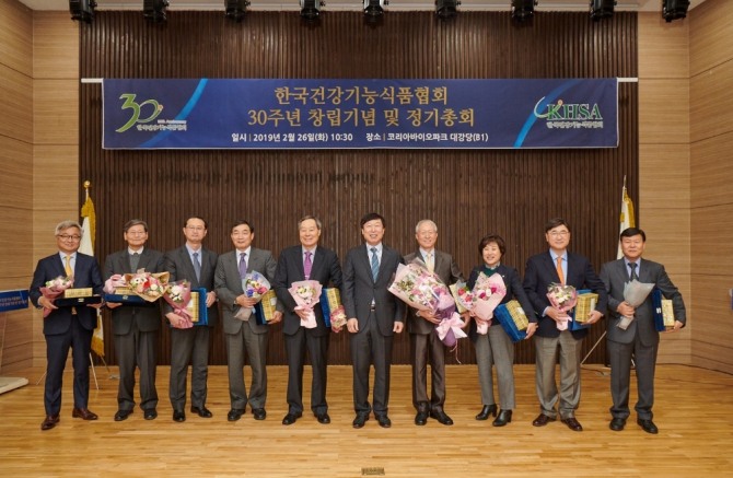 이미지 확대보기건기식협회는 창립 30주년을 맞아 한국의 건강기능식품산업과 협회 발전을 위해 헌신해온 전현직 협회장, 협회 30년사 편찬위원장 등에게 감사의 뜻을 전하기 위해 공로패를 제정했고, 유니베라 이병훈 회장, 풀무원 남승우 고문, 에코넷 홀딩스 조태형 고문 등 총 11명의 관계자들이 받았다.