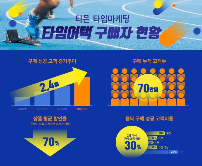 이미지 확대보기티몬은 타임어택을 통해 상품 구매에 성공한 고객이 행사 진행 첫달 대비 2.4배 늘었으며, 지금까지 누적 70만명에 달한다고 4일 밝혔다. 티몬은 지난해 11월 1일, LG노트북을 78% 할인된 9만9000원에 10대 판매하는 것을 시작으로 매일 5회에 걸쳐 타임어택 행사를 하고 있다.