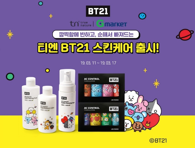 G마켓은 ‘티엔 BT21 스킨케어’ 출시를 기념해 전용 할인쿠폰 2종을 지급한다. ‘티엔 BT21’ 제품을 3만원 이상 구매하면 1000원을, 그 외의 티엔 제품을 1만원 이상 구매하면 1500원을 각각 할인 받을 수 있다. 또 ‘티엔 BT21’ 제품을 3만원 이상 구매한 고객을 대상으로 추첨을 통해 10명을 선정, BT21 포토카드 7종을 지급한다.