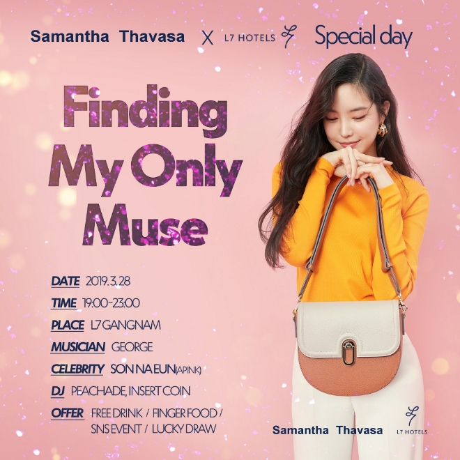 'L7 X 사만사타바사 스페셜 데이’는 오는 28일 오후 8시부터 L7강남의 ‘토크 앤 플레이(Talk&Play)’에서 개최된다. 에이핑크 손나은의 포토콜을 시작으로 DJ 피치에이드(PEACHADE), 가수 죠지(George), DJ 인서트 코인(INSERT COIN) 등의 공연이 이어진다.