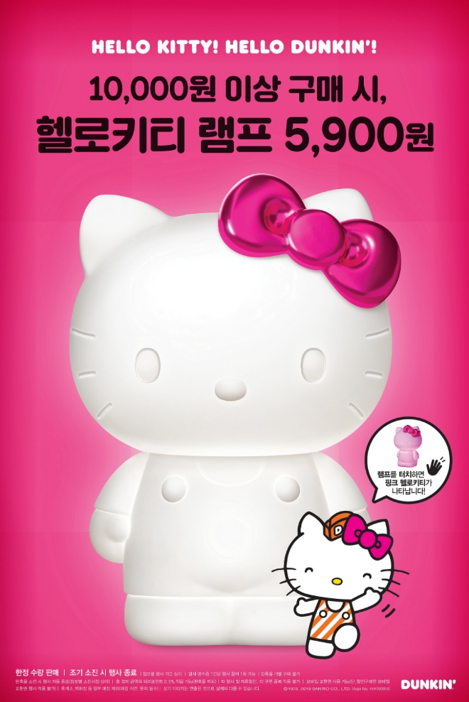 이미지 확대보기던킨도너츠는 ‘헬로키티 램프 프로모션’을 실시한다고 14일 밝혔다. 오는 15일부터 던킨도너츠 매장에서 1만원 이상 구매 시 ‘헬로키티 램프’를 5900원에 구매할 수 있는 행사다.