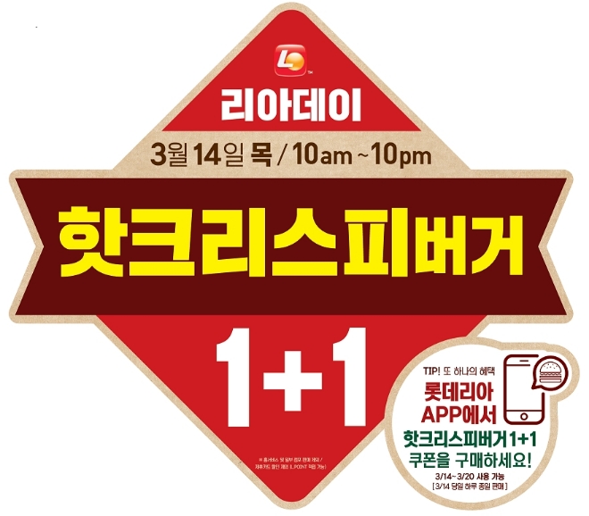 이미지 확대보기롯데리아는 3월 리아데이 행사로 ‘핫크리스피버거 1+1’ 이벤트를 14일 진행한다고 밝혔다. 14일 오전 10시부터 오후 10시까지 핫크리스피버거 1+1 행사를 진행한다. 핫크리스버거는 국내산 통 닭가슴살 패티에 하바네로 향이 가미돼 매콤함이 일품인 제품이다.