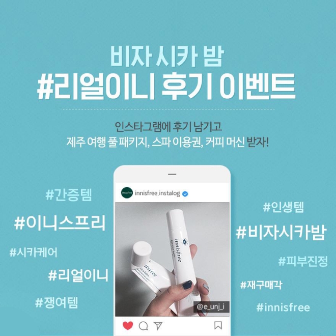 이미지 확대보기이니스프리는 18일부터 다음달 14일까지 ‘비자 시카 밤’ 리얼 사용 후기를 남기면, 추첨을 통해 제주도 여행권 등 푸짐한 경품을 증정하는 ‘#리얼이니 후기 이벤트’를 실시한다고 밝혔다.