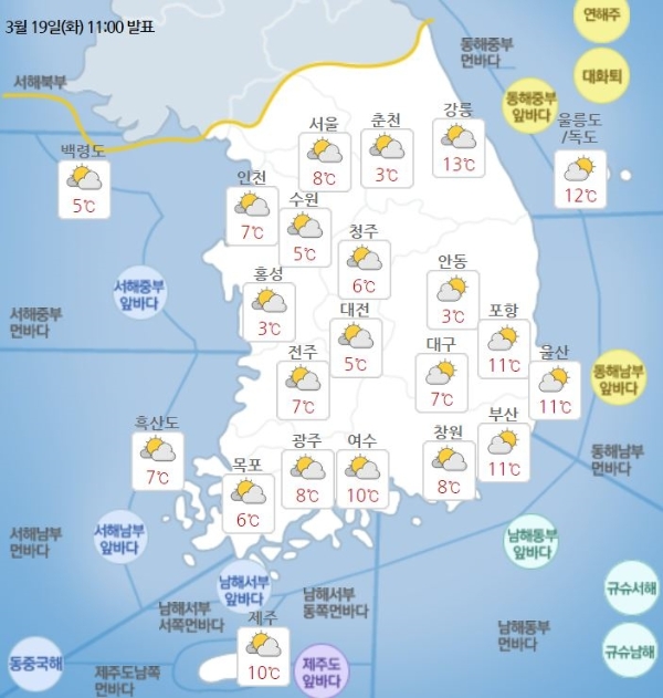 지역별 오전·오후 최저·최고 기온은 ▲서울·경기 5~19도 ▲강원영서 3~17도 ▲강원영동 13~21도 ▲충남 3~19도 ▲충북 6~20도 ▲전남 6~20도 ▲전북 7~20도 ▲경남 11~19도 ▲경북 3~22도 ▲제주도 10~19도 ▲울릉·독도 12~17도 ▲백령 5~9도로 예보됐다.
