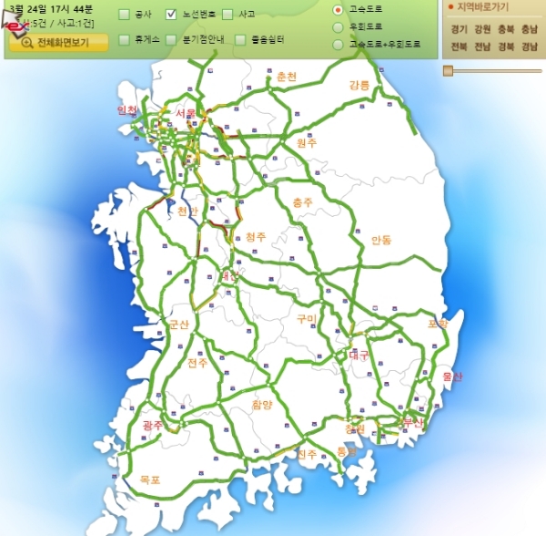 오후 5시기준 경부선 서울방향, 도동분기점부근 3.0㎞ 구간은 정체중이며 남이분기점부근~옥산 6.0㎞ 정체중이다. 또한 옥산부근~청주분기점부근 4.0㎞ 구간이 정체중이다.부산방향은 죽전부근~수원 6.0㎞ 구간이 정체중이다.