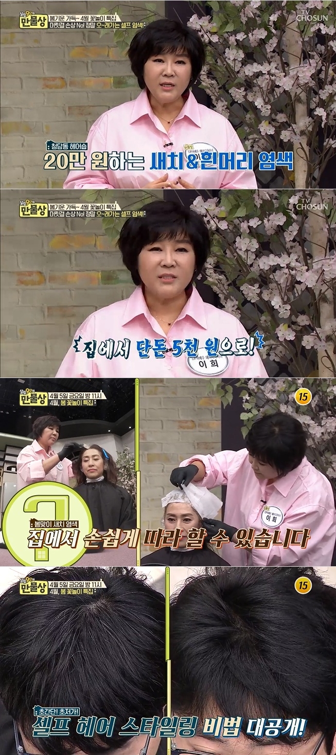 이미지 확대보기지난 5일 방송된 TV CHOSUN '살림9단의 만물상' 288회 봄 꽃놀이 특집으로 이희 헤어디자이너가 출연, 머릿결이 상하지도 않고 얼룩도 지지 않는 셀프 염색 비법을 공개해 시선을 사로잡았다.