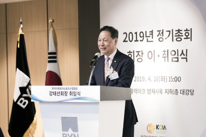 이미지 확대보기블랙야크는 강태선 회장이 16일 블랙야크 양재사옥 대강당에서 열린 ‘한국아웃도어스포츠산업협회 신임회장 취임식 및 2019 정기총회’에서 2대 회장으로 취임했다고 밝혔다. 강 신임 회장은 지난 2월 이사회 참석자들의 만장일치로 추대됐으며, 전임 회장인 콜핑 박만영 회장에 이어 앞으로 3년간 협회를 이끌며 대내외 다양한 역할을 수행할 예정이다.