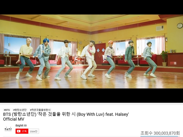한편 2013년 '2 COOL 4 SKOOL'을 발매하며 데뷔한 방탄소년단은 뮤직비디오 조회수 7억뷰 'DNA'를 비롯해 5억뷰 '불타오르네' 'FAKE LOVE', 4억뷰 '쩔어' 'MIC Drop' 리믹스, '피 땀 눈물; '‘IDOL', 3억뷰 'Save ME' '낫 투데이(Not Today)'에 이어 '작은 것들을 위한 시 (Boy With Luv) feat. Halsey'를 추가했다.
