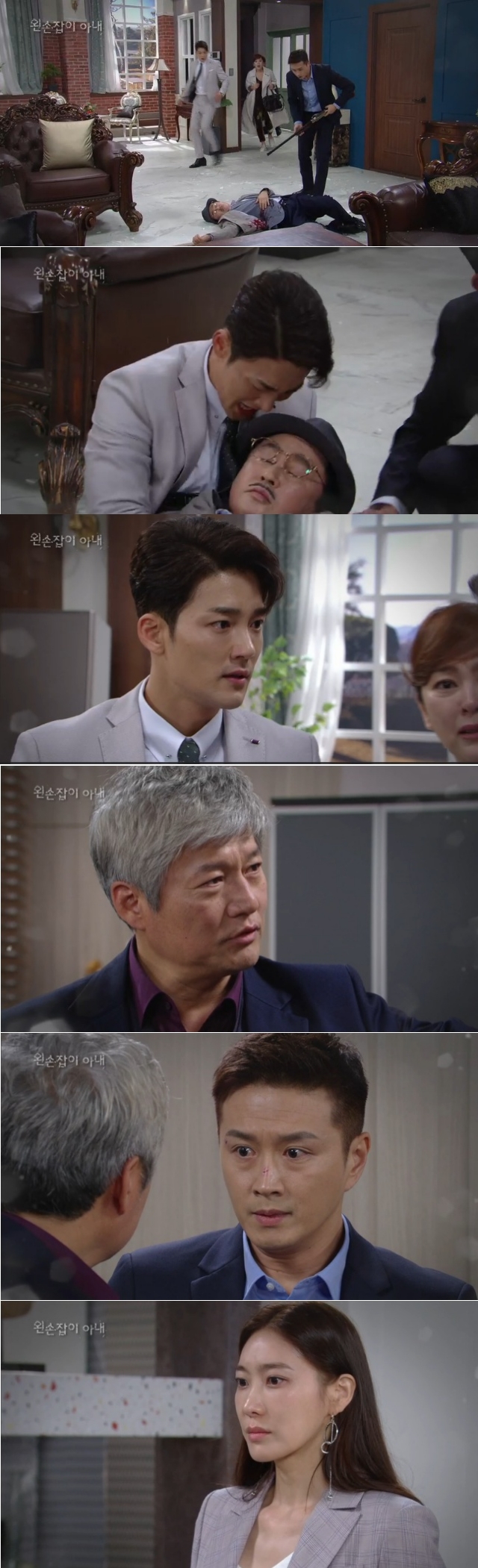 이미지 확대보기28일 오후 방송되는 KBS2TV 일일드라마 '왼손잡이 아내'(극본 문은아, 연출 김명욱) 100회에서는 별장 안에서 오 회장(최재성 분)의 총을 막던 김남준(진태현 분)이 박회장(김병기 분)을 죽였다는 누명을 쓰는 반전이 그려진다.