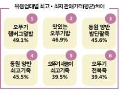 가격 차이가 가장 큰 상품은 '오뚜기 햄버그 덮밥'으로 전통시장(3613원)과 대형마트(1838원) 간 무려 1775원(49.1%) 차이가 났다.