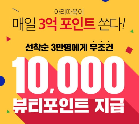 선착순 3만명에게 1만 뷰티포인트를 지급하는 이벤트로 5~8일 매일 오전 9시에 진행된다. 단 선착순 마감이며, 포인트는 당일만 사용가능하고 익일 소멸된다.