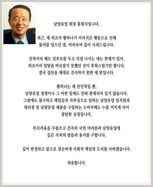 그는 "최근 제 외조카 황하나가 어리석은 행동으로 인해 물의를 일으킨 점 머리 숙여 깊이 사죄드린다. 친척이라 해도 친부모를 두고 직접 나서는 데는 한계가 있어 외조카의 일탈을 바로잡지 못했던 것이 후회스럽기만 하다"고 말했다.