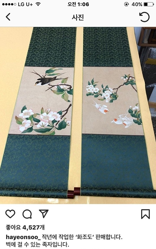 이미지 확대보기19일 온라인커뮤니티에 따르면 하연수는 18일 자신의 인스타그램에 "작년에 작업한 '화조도' 판매합니다. 벽에 걸 수 있는 족자입니다"라면서 직접 그린 화조도 족자를 찍은 사진 한 장을 게재했다.