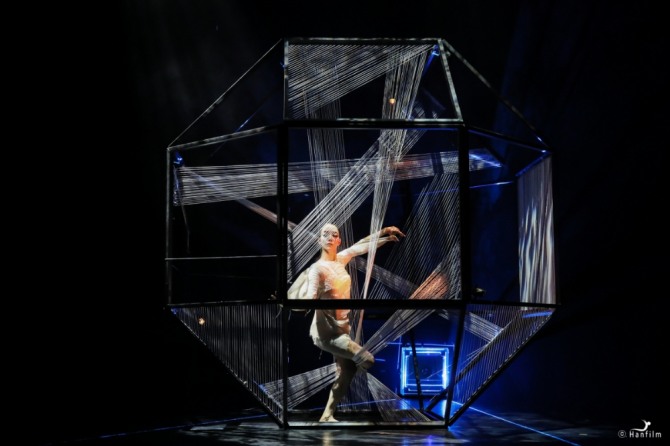 이미지 확대보기막이 열리면 왼 편의 다면의 구조물 하나가 눈에 띈다. 움직임이 가능한 철골 구조물에 실들이 엮어있다. 틀 안의 실루엣 위주의 움직임이 보인다. 알 안에서 음악과 어우러져 공간을 탐험하기도 하고, 고무줄(실)의 탄성을 이용한 움직임이 진행되다가 구조물을 뚫고 나온다. 구조물 안에 있을 때의 의상은 스킨톤으로 몸의 형태가 드러난다. 구조물 밖으로 나왔을 때의 의상은 감겨있던 주름소재의 천을 풀어내고 하나의 소품처럼 구조물과 연결되어 바닥에 남는다.
