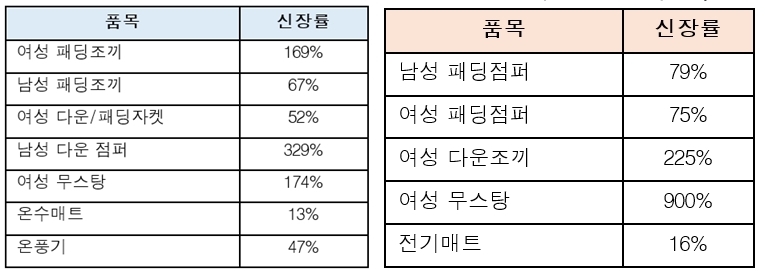 실제로 오픈마켓 G마켓에서 5월 18일부터 6월 17일까지 최근 한 달 동안 남성 다운점퍼는 전년 같은 기간에 비해 329%나 매출이 증가했다. 여성 무스탕과 여성 패딩조끼는 174%와 169% 매출이 각각 신장했다. 이 기간 온풍기는 47%, 온수매트는 13% 매출이 전년보다 뛰었다.