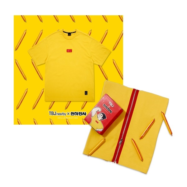 천하장사 상징인 노란필름과 빨간 컷테이프 활용한 한정 티셔츠+소시지로 구성