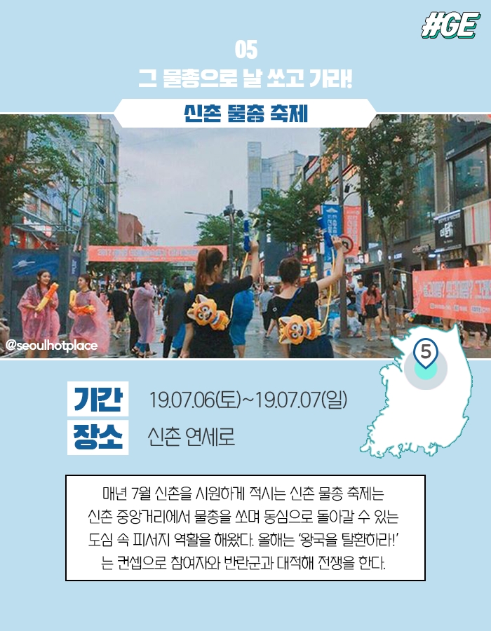 도심 한가운데 속 매년 7월 신촌을 시원하게 적시는 '신촌 물총 축제'는'신촌 중앙거리'에서 물총을 쏘며 동심으로 돌아갈 수 있는