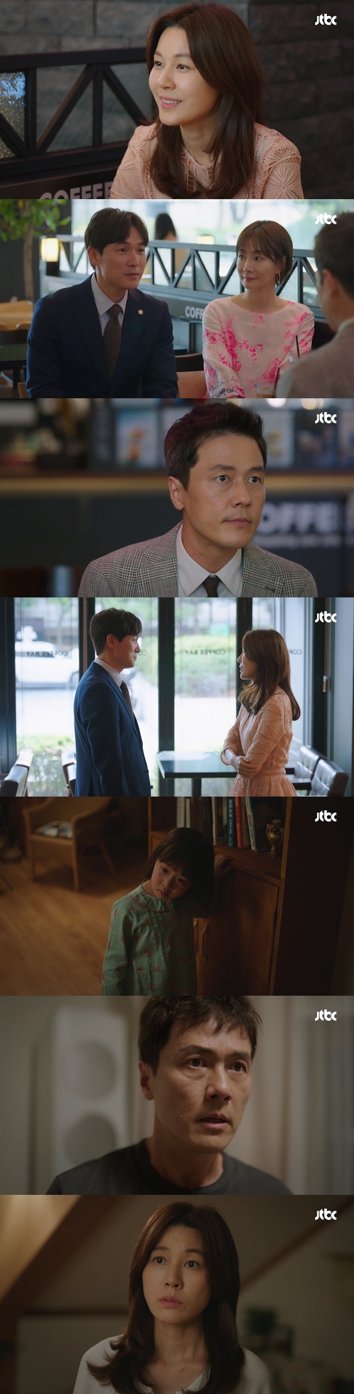 이미지 확대보기9일 방송된 JTBC 월화드라마 '바람이 분다'(극본 황주하, 연출 정정화·김보경) 14회에는 수진(김하늘 분)의 극진한 보살핌으로 과거 첫사랑 당시 기억을 회복한 권도훈(감우성 분)이 루미초콜릿 특허 소송을 담당한 문경훈(김영재 분)을 질투해 공격성을 드러내는 충격 반전이 그려졌다.
