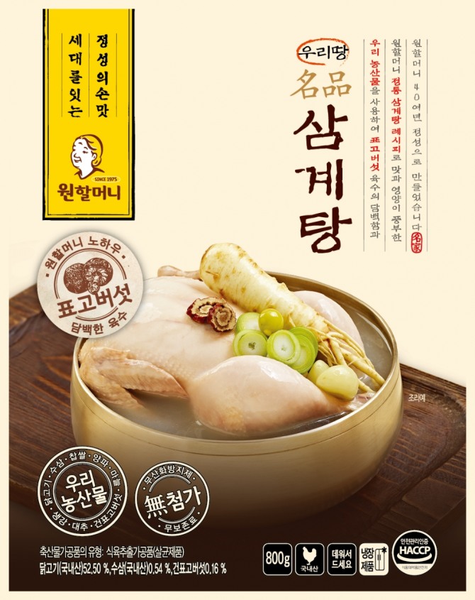 이미지 확대보기제품은 원할머니 정통 삼계탕 레시피로 만들어진 보양 간편식이다. 엄선한 국내산 닭 한마리에 표고버섯과 수삼, 찹쌀, 대추 등이 들어갔다.