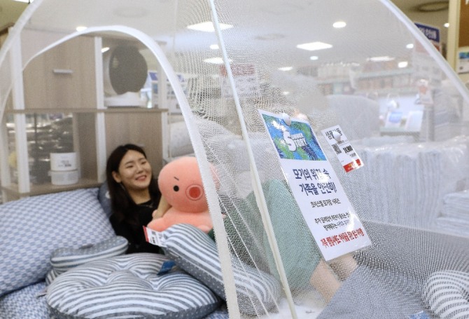 이미지 확대보기롯데마트 서울역점에서 한 고객이 냉감 소재 침구와 원터치 모기장을 이용하고 있다. 사진=롯데마트