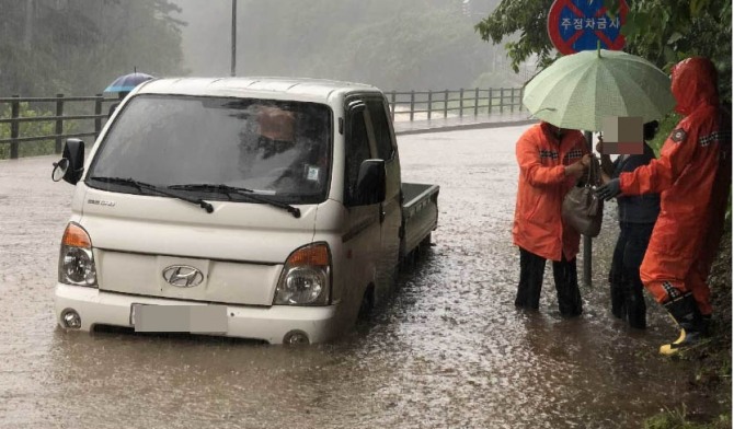 울산 울주군 삼남면 작천정 계곡 물에 고립된 차량 운전자도 119구조대원에 의해 무사히 구조됐다.
