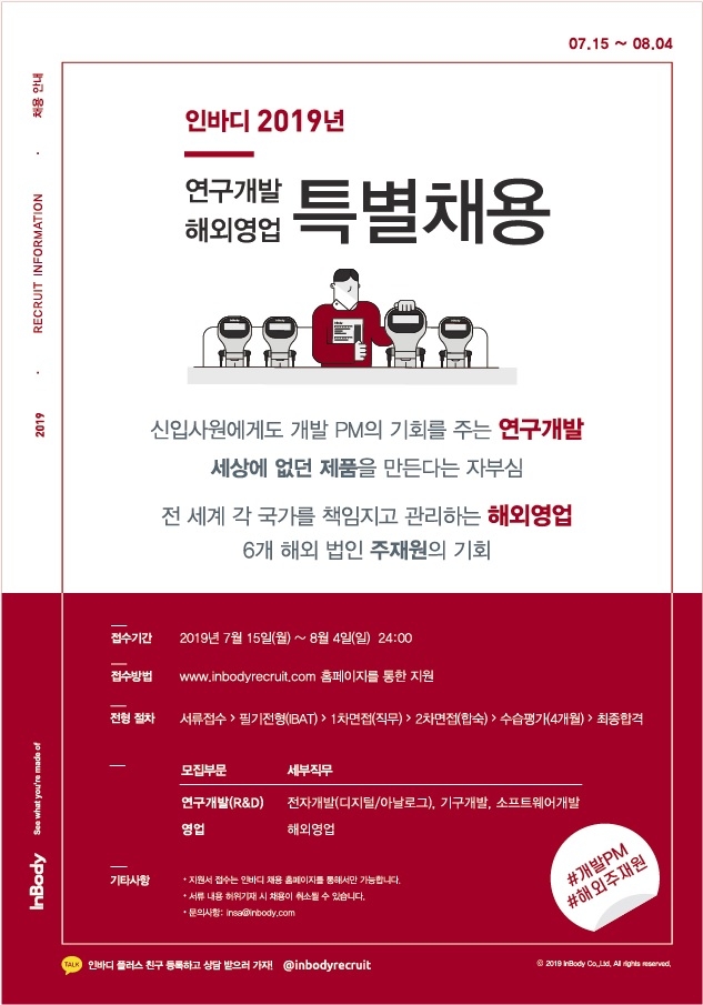 이미지 확대보기인바디(대표 차기철)가 8월 4일까지 연구개발과 해외영업 전담 인원을 특별채용 한다.