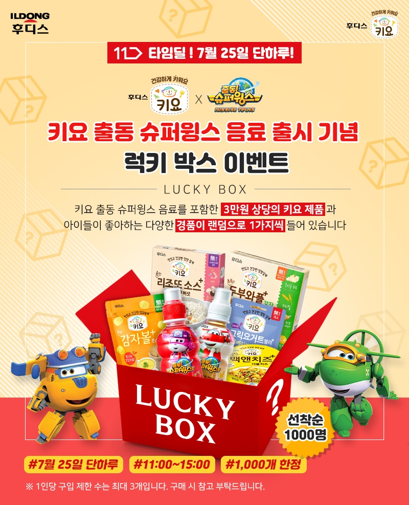 이미지 확대보기일동후디스의 어린이 식품 브랜드 ‘키요’가 25일 단 하루, ‘키요 출동 슈퍼윙스’의 출시를 기념해 ‘럭키 박스 이벤트’를 벌인다고 밝혔다.