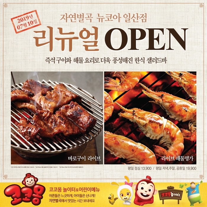 이외에도 리뉴얼 오픈을 맞아 돼지갈비, 바베큐 보쌈, 훈제오리구이, 철판새우구이 등 다양한 고기와 해물 메뉴들을 즉석에서 직접 구워주는 라이브 메뉴도 함께 출시했다.
