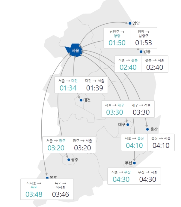 서울행의 경우 ▲대전 출발 시 1시간39분 ▲강릉 출발 시 2시간40분 ▲대구 출발 시 3시간30분 ▲광주 출발 시 3시간20분 ▲울산 출발 시 4시간10분 ▲목포 출발 시 3시간46분 ▲부산 출발 시 4시간30분 이 소요될 것으로 예상된다,