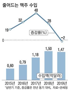 이미지 확대보기기세 좋던 수입맥주가 ‘NO 재팬’ 운동의 확산 영향 등으로 10년 만에 마이너스 성장한 것으로 나타났다.