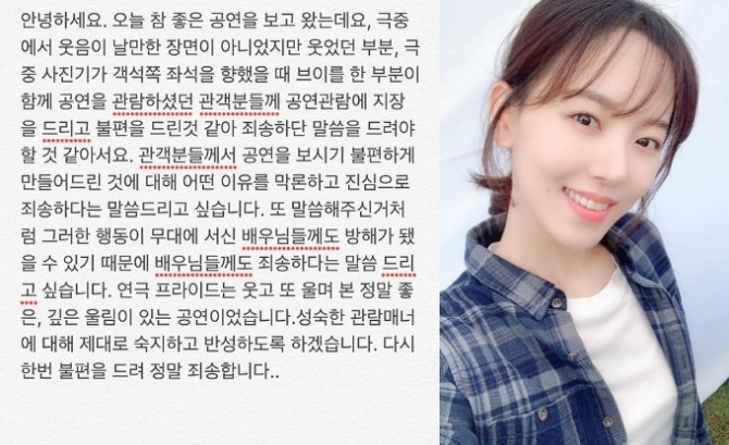 그는 "관객들이 공연을 보기 불편하게 만들었다. 어떤 이유를 막론하고 진심으로 죄송하다. 그러한 행동이 무대에 선 배우들에게도 방해가 될 수 있기에 배우들에게도 죄송하다고 말하고 싶다"며 "연극 '프라이드'는 웃고 또 울며 본 정말 좋은, 깊은 울림이 있는 공연이었다. 성숙한 관람 매너를 제대로 숙지하고 반성하겠다. 다시 한 번 불편을 줘 죄송하다"며 거듭 고개를 숙였다.