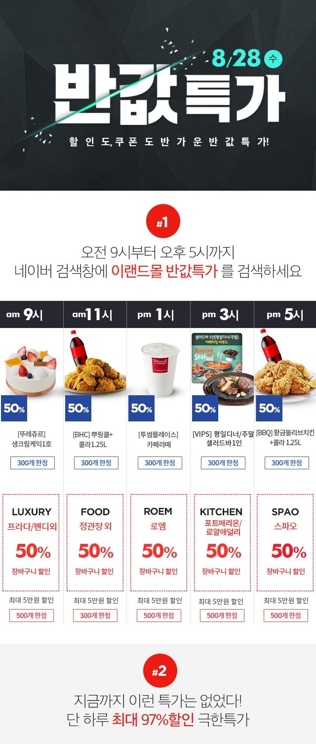 인기 먹거리 반값 쿠폰 총 1,500장 선착순 증정, 시간대별 기획전 반값쿠폰도 마련