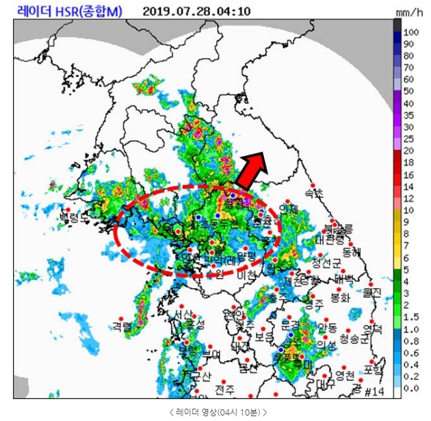 북태평양고기압의 가장자리를 따라 유입되는 따뜻하고 습한 공기와 북쪽의 차고 건조한 공기가 만나 만들어진 정체전선이 서해상에서 중부지방으로 이어지면서 서울과 경기북부, 강원영서북부를 중심으로 비가 오고 있고, 호우특보가 발효 중인 일부 경기서해안과 경기북부에는 시간당 20mm 내외의 강한 비가 오는 곳이 있다.