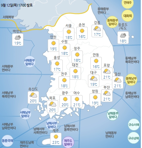 12일 저녁에는 전국이 흐리고 서울경기도와 강원영서북부, 충남북부, 경상도는 밤(24시)까지 비가 오는 곳이 있겠고 그 밖의 전국에는 산발적으로 빗방울이 떨어지는 곳이 있겠다.