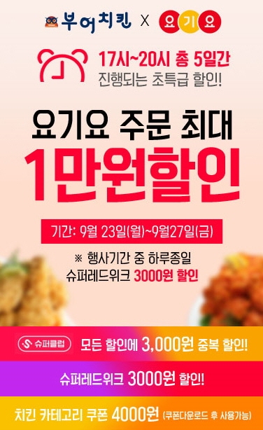 이미지 확대보기이 기간 ‘요기요’ 앱에서 진행되는 이번 이벤트는 오후 5시부터 8시까지 치킨카테고리 4000원 쿠폰 할인과 하루 종일 3000원이 할인되는 슈퍼레드위크, 슈퍼클럽 3000원 할인이 적용돼 중복 적용 때 최대 1만 원까지 할인이 가능하다.