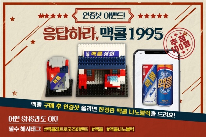 응모 방법은 개인 SNS 계정에 맥콜 구매 인증샷과 해시태그 미션 키워드 ‘#맥콜레트로굿즈이벤트’, ‘#맥콜1995’, ‘#맥콜나노블록’ 3개를 함께 업로드한 후 일화 페이스북 공식계정에 SNS 계정, ID, 참여완료 댓글을 남기면 된다.
