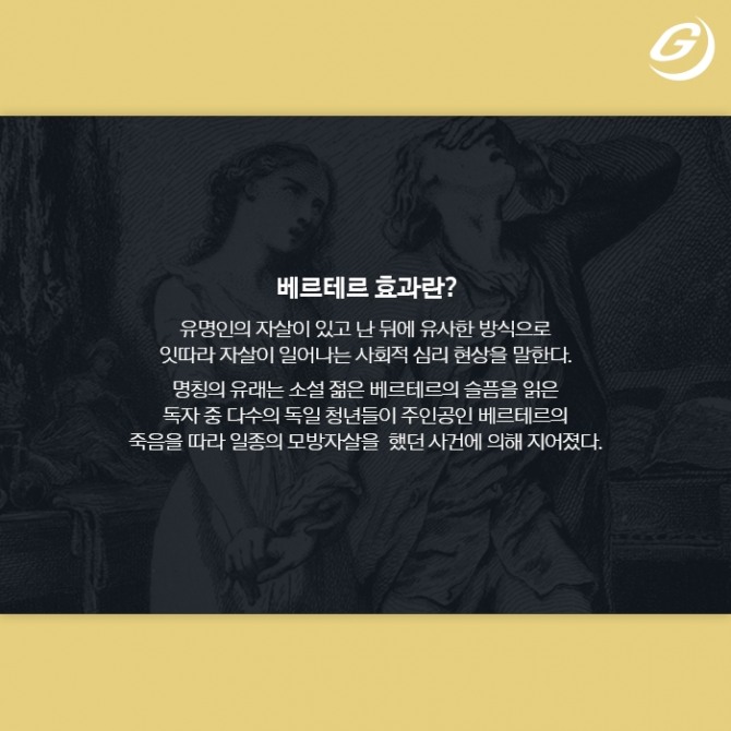 유명인의 자살이 있고 난 뒤에 유사한 방식으로 잇따라 자살이 일어나는 사회적 심리 현상을 말한다.