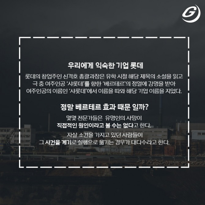 자살 소견을 가지고 있던 사람들이 그 사건을 계기로 실행으로 옮기는 경우가 대다수라고 한다.