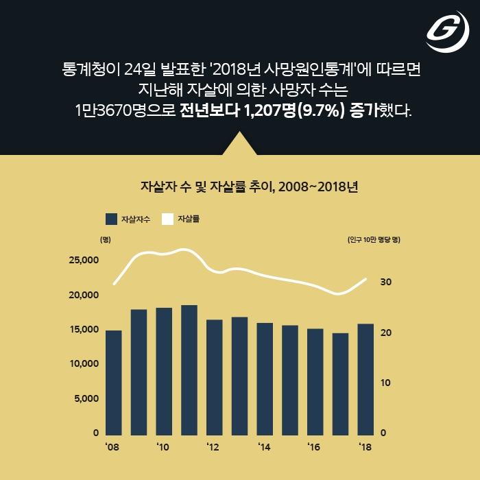 통계청이 24일 발표한 '2018년 사망원인통계'에 따르면 지난해 자살에 의한 사망자 수는 1만3670명으로 전년보다 1,207명(9.7%) 증가했다.